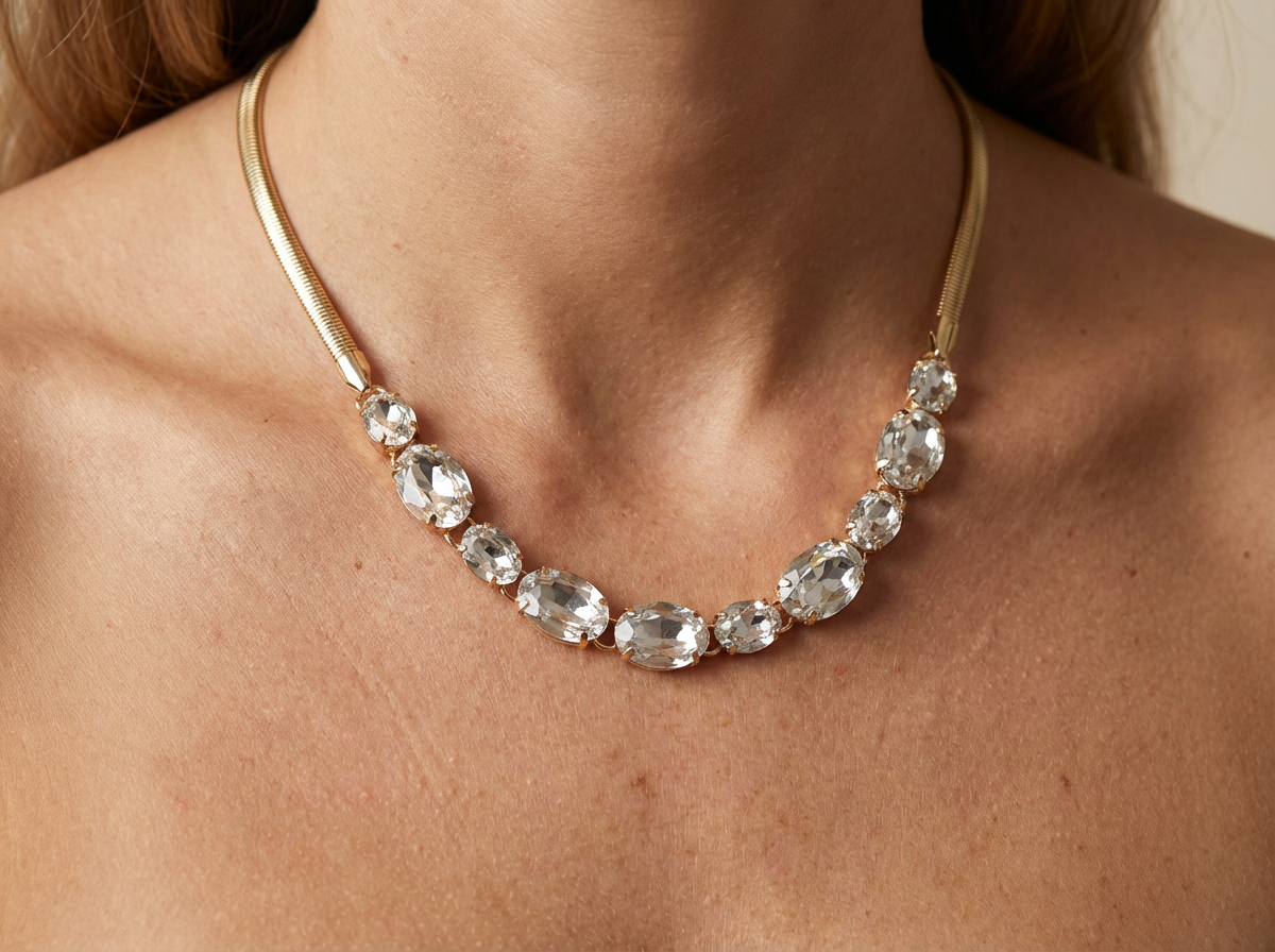Colar Malha elegante com pedras ovais transparentes lapidadas, que refletem a luz com sutileza. Versátil e atemporal, combina com diferentes estilos e ocasiões.